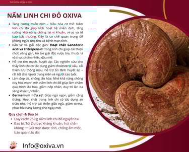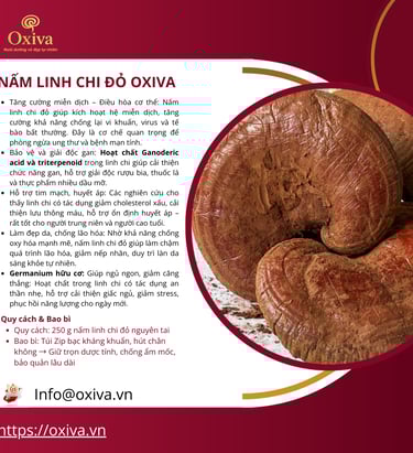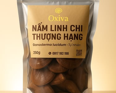 Nấm Linh Chi Đỏ Oxiva được nuôi trồng theo công nghệ Nhật Bản tại trang trại An Lộc Farm (Đồng Nai). Quy trình khép kín – không hóa chất – sấy chuẩn ≤60°C giúp giữ trọn dược tính quý, mang đến sản phẩm an toàn và tinh khiết.